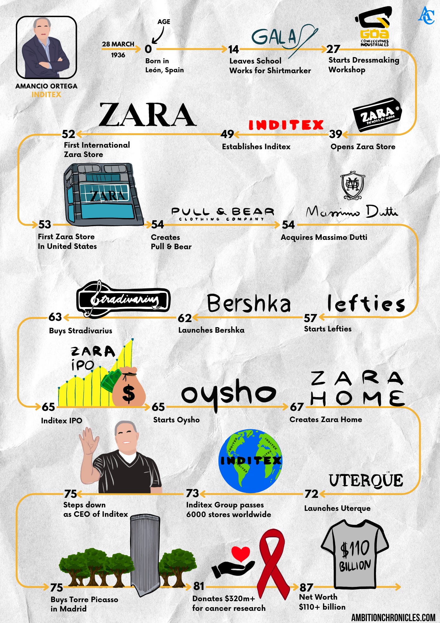During his 50s and 60s, he creates Pull and Bear, acquires Massimo Dutti, creates Lefties, Bershka, buys Stradivarius, launches Oysho and takes Inditex public on the Spanish stock market.